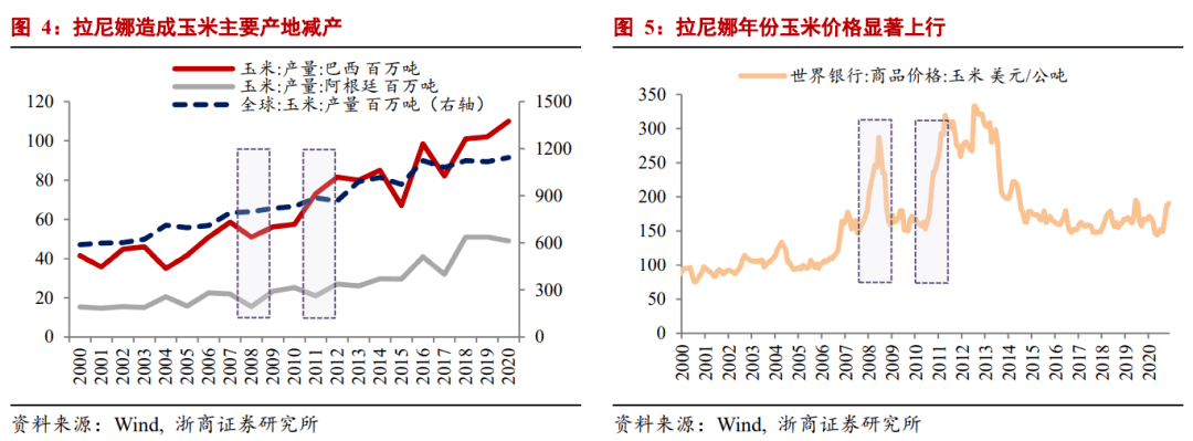 玉米产量和价格也受到气候条件的显著影响。2007年8月至2008年5月的拉尼娜现象导致世界主要玉米产区巴西和阿根廷的玉米减产;在2010年6月至2011年5月的拉尼娜期间,阿根廷玉米产量再次大幅下降。因此,2008年和2011年玉米价格大幅上涨。