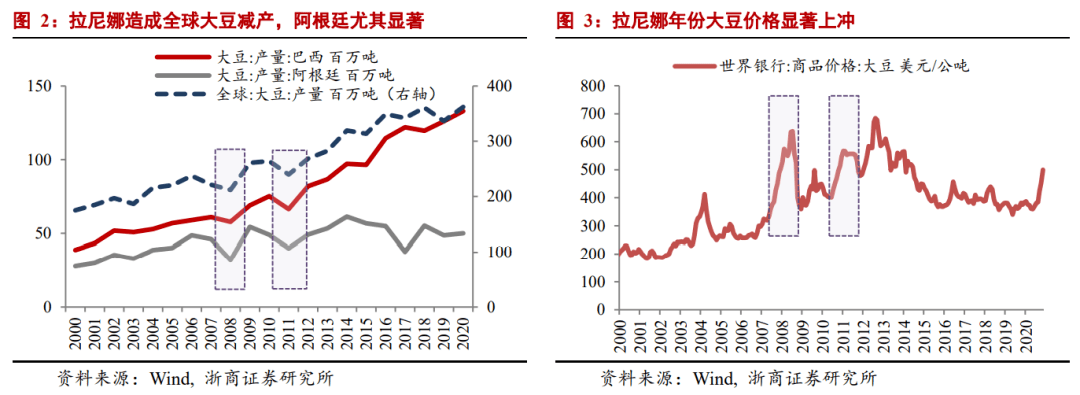 品种方面,低温干旱气候下大豆成熟会延迟,植株短,叶片小,荚数减少,最终影响大豆单位面积产量。2007年8月至2008年5月和2010年6月至2011年5月的两次中度拉尼娜现象都导致了全球大豆产量下降,巴西和阿根廷受到了严重影响。因此,2008年和2011年大豆价格大幅上涨。