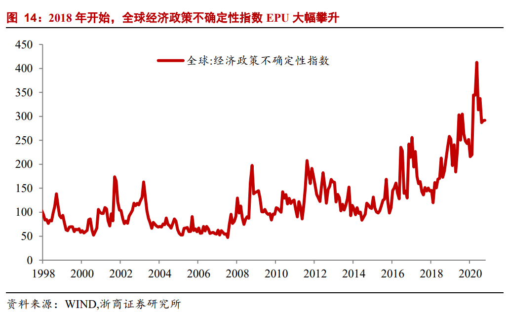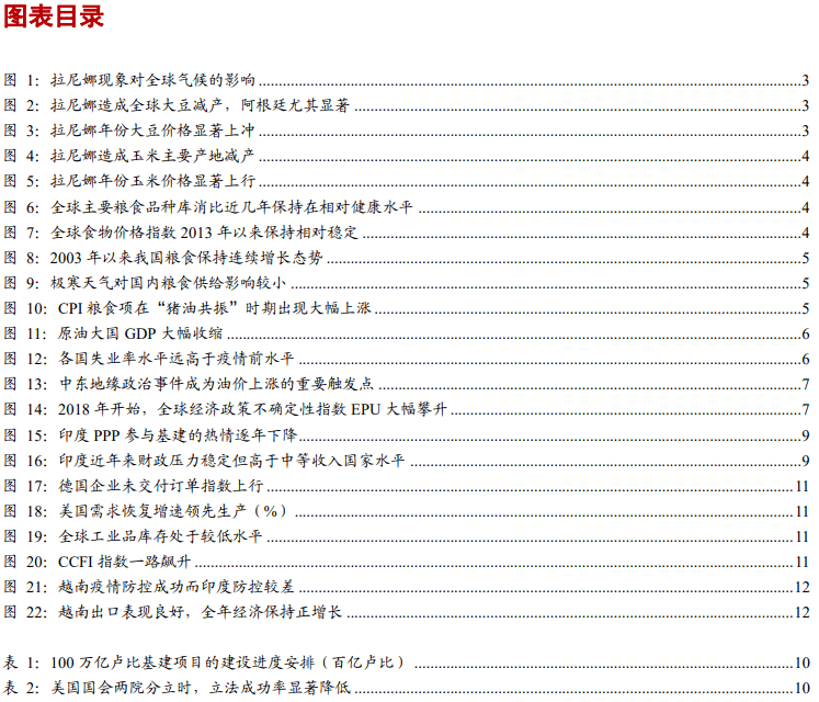 根据世界气象组织的判断,目前的拉尼娜现象已经形成,预计持续到2021年。在拉尼娜发生的冬季,我国寒潮和冷空气活动频繁,中东部地区气温低于正常,长江以南大部分地区降水量低于正常。从全球来看,拉尼娜事件往往导致东北亚和非洲西海岸异常寒冷,美国西南部和南美洲西海岸异常干燥,澳大利亚和东南亚降水增加。拉尼娜事件可能导致美国、巴西和阿根廷的玉米产量下降,并影响南美部分地区的大豆生长。此外,东北亚的冻害可能导致冬小麦产量下降。如果像蝗虫这样的自然灾害叠加在一起,高于预期的食品价格上涨可能会在更长一段时间内引发全球通胀。