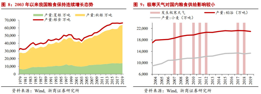 从我国的经验来看,拉尼娜事件对我国粮食生产影响不大。在拉尼娜事件的这些年里,中国的粮食供应并没有受到明显的影响。自2003年以来,中国粮食产量一直保持持续上升趋势,因此供应方的压力较小。然而,寒冷冬季对“储存粮食”的需求可能会略微推高粮价。事实上,2004年我国粮食价格形成机制改革推进后,CPI粮食项目只在“猪油共振”时期大幅上涨,而其他时期粮食价格基本保持适度上涨。