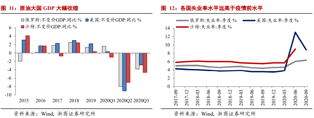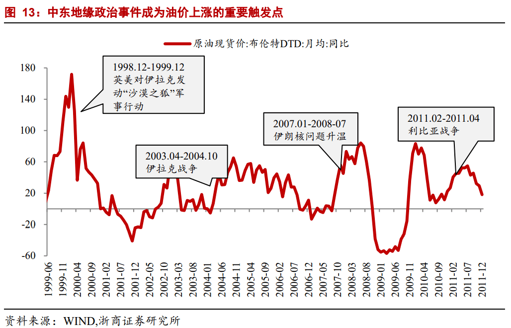 自20世纪70年代2020年全年原油市场处于低价、低产的状态,原油大国的经济状况受到较大冲击,俄罗斯、沙特等中东国家的GDP大幅收缩。以来,中东地缘政治事件,如第四次中东战争、第五次中东战争、伊拉克战争、巴以冲突、伊朗核问题和利比亚战争,往往成为油价上涨的重要触发因素。以2011年利比亚战争为例,2月17日战争爆发时布伦特原油价格为103美元/桶,仅53天后布油价格升至127美元/桶,涨幅超过20%,同比涨幅约40%。