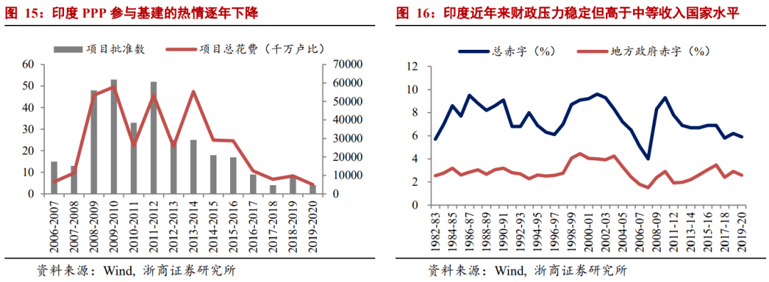 在美国印度基建投资落地带来需求超预期,私人资本参与基础设施项目的热情近年来逐渐减弱。基建项目周期长,回报慢。在过去的六年里,参与印度基础设施项目的公私伙伴关系的总规模迅速下降。从2019年到2020年,只有四个公私伙伴关系参与基础设施项目,项目总规模只有卢比。501亿。这两项数据都已降至历史冰点。二是近年来印度政府财政赤字控制基本稳定,但水平相对较高(且存在一些隐性债务),2019年为5.9%。受疫情影响,印度央行预计今年赤字比例将升至6.1%,中等收入国家整体债务和赤字水平相对较高。印度疫情仍未解决,明年可能持续受影响,政府税收可能难以改善(今年税收预计缩水-14%)。在这种情况下,地方政府很难在2021年建设基础设施,也很难保证NIP推广的速度。