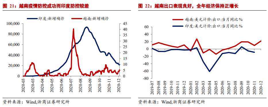如果印度未来五年1.4万亿美元的基础设施投资计划和拜登上台后的大规模财政刺激政策能够成功实施,两国基础设施的推进超出预期并产生共鸣,大宗商品价格将从需求侧上涨,带动拉美、俄罗斯等资源禀赋国家的经济复苏。这些国家大多产业链单一,国内收入上升会拉动进口需求,进而带动中国、越南等加工制造经济体的出口规模增长。这种情景的实质是,美国和金砖国家在推动全球经济复苏,而宽松的货币政策在新冠肺炎疫情叠加期间并未退出,从需求侧推动通胀水平上升。