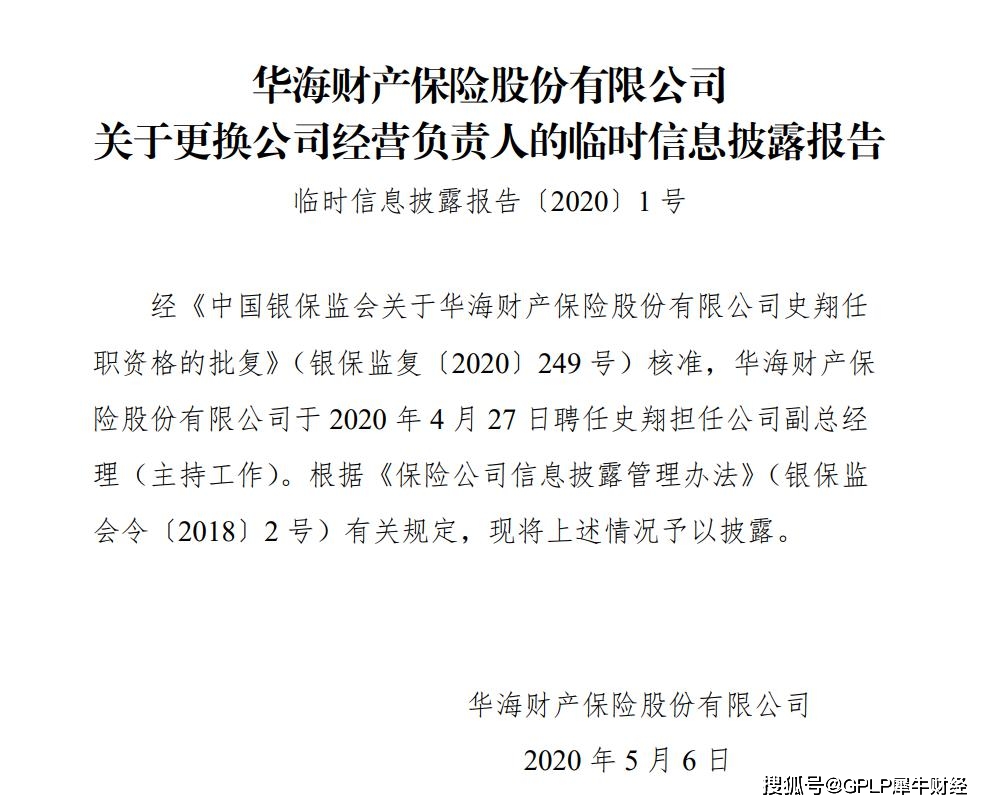 2020年5月6日,华海财产保险宣布于2020年4月27日任命石祥为公司副总经理。