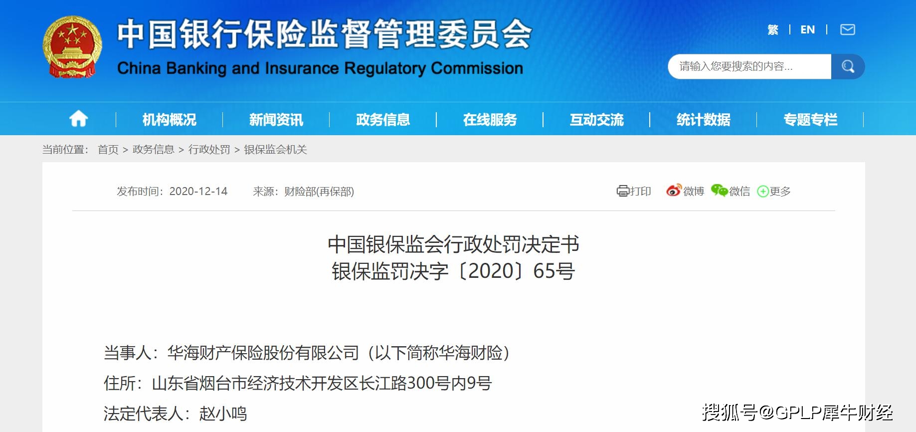 银监会对华海财险处以51万元罚款;董事长赵小明被警告并罚款10万元。