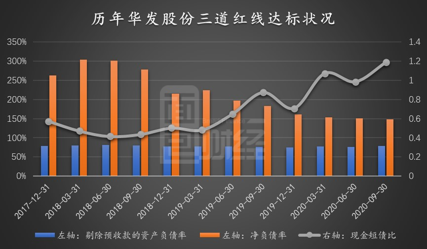 三条红线两条踩线,财务属于“橙”档。截至2020年9月底,法华股票不含预收账款的资产负债率为78.54%,比2019年底上升1.71个百分点,超过监管红线;净负债率148.35%,比2019年底下降2.33个百分点,超过监管红线;现金债务比率为1.19倍,比2019年底上升20.3个百分点,符合监管要求。