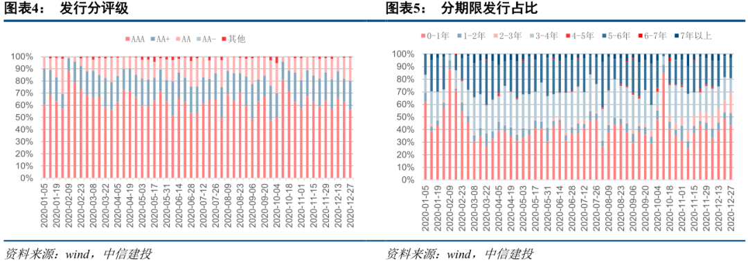 上周(12.21-12.27),发行净融:信用债券一级市场发行量达到1550.63亿元,还款总额2115.63亿元,融资净额-565.00亿元。评级方面,上周高评级AAA发行占比下降6.5个百分点至56.32%,AA发行占比上升5个百分点至23.82%,AA发行占比上升3个百分点至19.12%。从期限结构来看,一年发行金额占比49.02%,下降6个百分点,5-6年发行金额占比15.86%,下降1个百分点,1-3年发行金额增幅较大。上周(12.21-12.27),一级市场发行不振,延期或取消债券17只,总额84.00亿元,仍以城市投资为主。本周将有1273.86亿信用债券到期,其中938.90亿为AAA级,228.98亿为AA级。