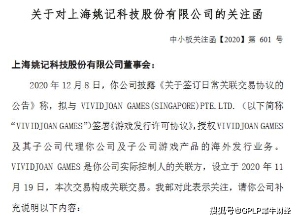 12月22日,姚记科技(002605。SZ)收到深交所的关注函。12月8日,瑶姬科技宣布,瑶姬科技及其子公司拟与瑶姬科技关联方VIVIDJOAN GAMES签订协议,授权VIVIDJOAN GAMES及其子公司代理瑶姬科技及其子公司游戏产品的海外分销。