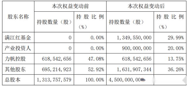公告称,本次重组通过将资本公积转换为股票实现股权变更。股权变更完成后,满江红基金和行业投资者将分别占上市公司总股本的29.99%和20%。原控股股东力帆控股的持股比例从47.08%左右降至13.75%左右。