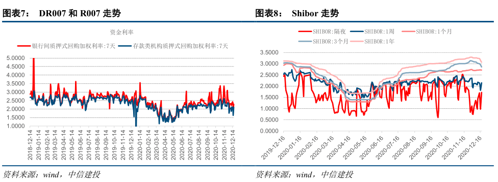 市场流动性观察:上周(12.14-12.20),央行公开市场1500亿元的逆回购和3000亿元的传销到期,央行进行了600亿元的逆回购和9500亿元的传销操作,所以上周净投资5600亿元。本周(12.21-12.27),央行公开市场600亿元逆回购到期。上周MLF过度延续,央行继续关注流动性,中期存款利率受益最直接。上周,DR007下跌1.4个基点至2.1137%;Shibor隔夜上涨29.2个基点至1.7230%。中央经济工作会议明确,宏观政策强调连续性,不急转弯,即边际紧缩,缓慢踩刹车,稳健的货币政策要灵活、精确、合理、适度,对货币紧缩的担忧要适当缓解。