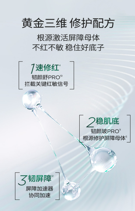 例如,从1.0-2.0,润百颜在“4重屏障修护”的基础上,进行精准成分的升级,打造“韧颜玻+韧颜舒”的修护CP,前者是润百颜在玻尿酸复配上的全新创造,后者则是其和国际大厂亚什兰基于诺奖灵感共同打造的退红高效成分;而此次2.0-3.0的升级则进一步拓宽了修护靶点,聚焦基底膜根源修护,打造了“韧颜玻PRO+韧颜舒PRO+屏障加速器”的黄金三维修护逻辑,进一步从修护理论上进行创新。