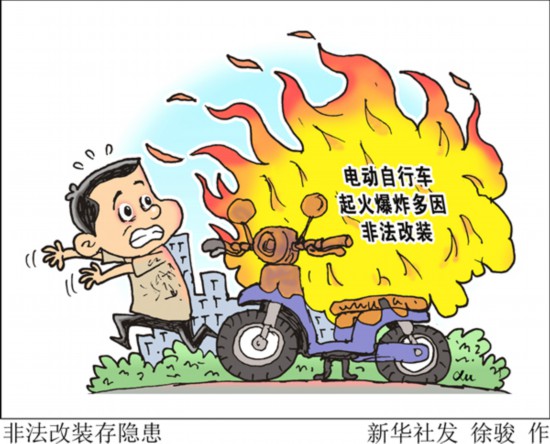 一般情况下,正规厂家生产的电动自行车及电池符合相关安全标准,很大一部分起火事故因非法改装造成。一些商家擅自增加电池容量,将体积大、容量小的铅酸电池非法改装成体积小、容量大的锂电池。在改装过程中,容易破坏整车电气线路的安全性能,从而引发车辆电气线路过载、短路等故障。提醒广大消费者切勿非法改装,若电动自行车电池已过有效期或者发生质量问题需要更换,尽量更换同款电池产品,避免因电池不适配而引发事故。
